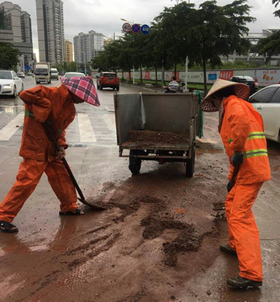 ▲環(huán)衛(wèi)工人清理暴雨過(guò)后積泥