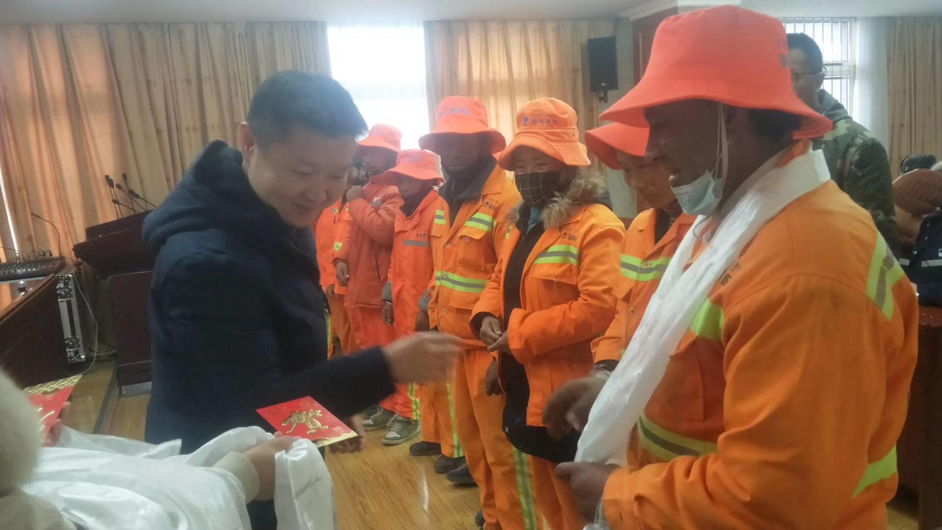 1月13日,日喀則桑珠孜區(qū)民政局區(qū)長前往國策環(huán)保日喀則分公司慰問公司環(huán)衛(wèi)工人,為他們一一獻(xiàn)上哈達(dá),發(fā)放新年慰問金,向城市美容師致以敬意,并向他們送出了誠摯的新年祝福!