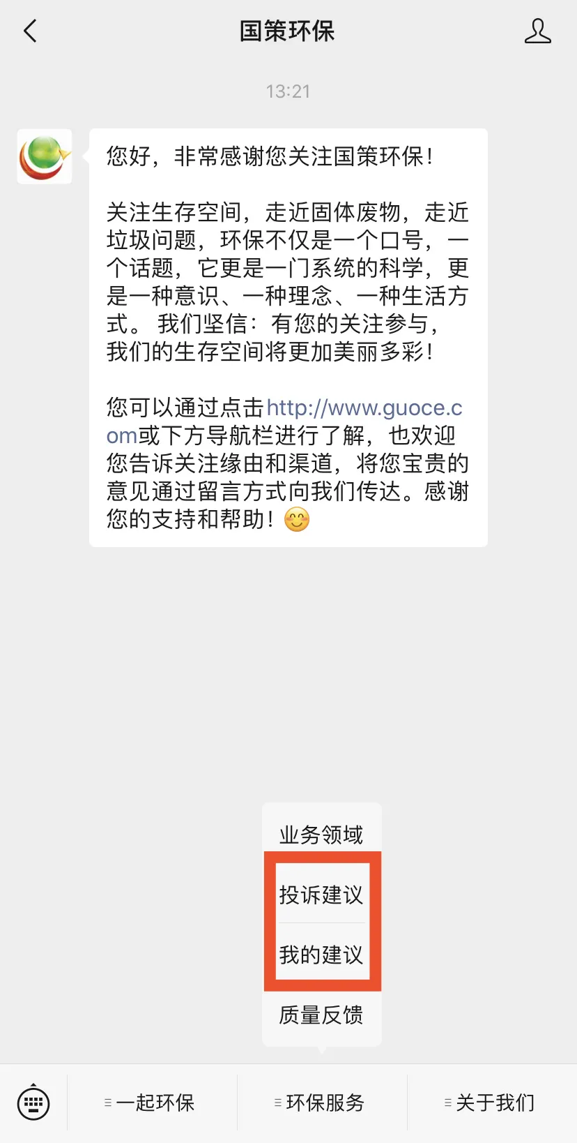 同時(shí),社會(huì)公眾可通過關(guān)注國(guó)策環(huán)保微信公眾號(hào),對(duì)國(guó)策環(huán)保運(yùn)營(yíng)項(xiàng)目的環(huán)衛(wèi)質(zhì)量和服務(wù)水平提出意見和建議,對(duì)保潔不到位、清運(yùn)不及時(shí)的路段或點(diǎn)位拍照上傳,反饋到云平臺(tái),國(guó)策環(huán)保將根據(jù)處理進(jìn)度,推送處理結(jié)果,達(dá)到社會(huì)共治的創(chuàng)舉。