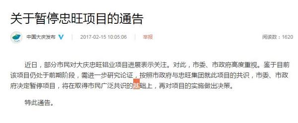 黑龍江大慶市委宣傳部官方微博今日發(fā)布《關(guān)于暫停忠旺項(xiàng)目的通告》稱,近日,部分市民對(duì)大慶忠旺鋁業(yè)項(xiàng)目進(jìn)展表示關(guān)注。對(duì)此,市委、市政府高度重視。鑒于目前該項(xiàng)目仍處于前期階段,需進(jìn)一步研究論證,按照市政府與忠旺集團(tuán)就此項(xiàng)目的共識(shí),市委、市政府決定暫停項(xiàng)目,將在取得市民廣泛共識(shí)的基礎(chǔ)上,再對(duì)項(xiàng)目的實(shí)施做出決策。